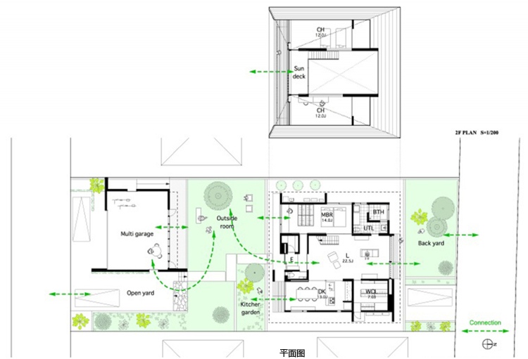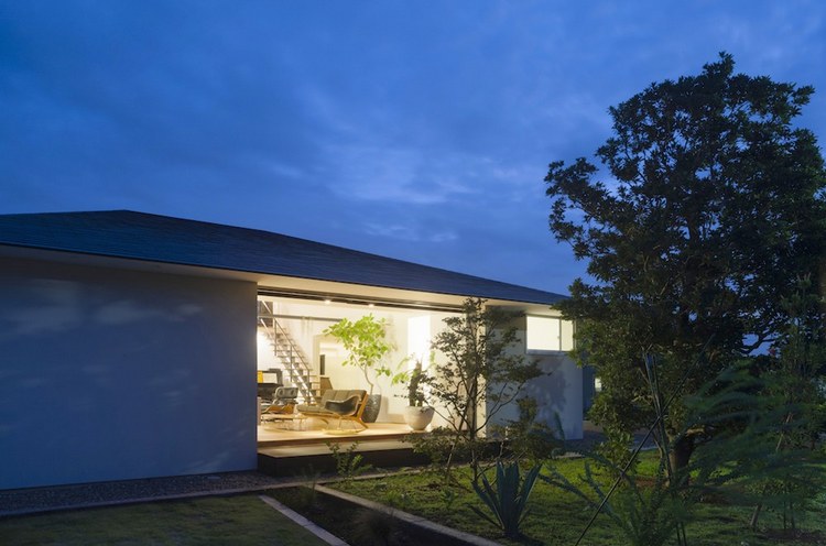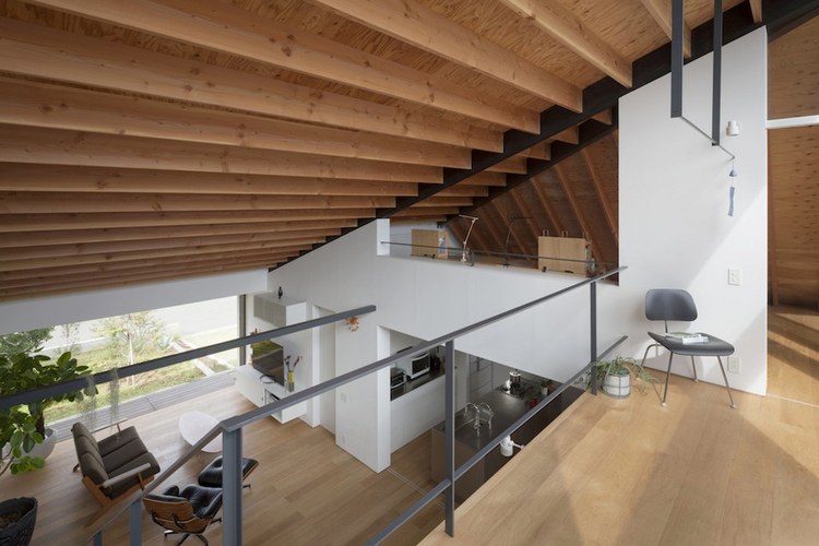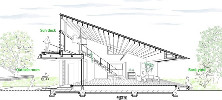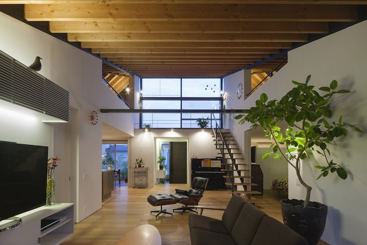 房屋內有一個開放的客廳,與主臥相交,浴室、餐廳、廚房及洗手間位于外部區域。客廳空間的橫向延伸,通過“天臺”(或陽臺樣中間空間位于內部與外部之間)對外界。生活的空間,可自由分割為必要的滑動門,提供適當程度的隱私和家庭成員聚集地的同時,和日本傳統住宅一樣。